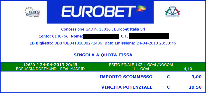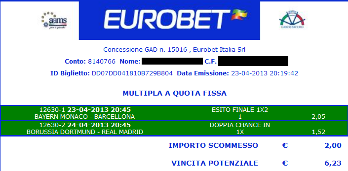 Vi pubblico le ricevute delle scommesse vincenti giocate con i pronostici Champions League del 23-24/04/2013 .