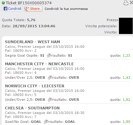 Scommesse Vincenti Sabato 03-10-2015 Book Consigliati e Recensiti 1 15 € GRATIS + 1024 € 4.8 / 5 TOTAL SCORE Check >>> Check >>> 2 30 euro + 20 giocate gratis 3.9 / 5 TOTAL SCORE Check >>> Check >>> 3 5 € GRATIS + 300 4.6 / 5 TOTAL SCORE Check >>> Check >>> 4 100 € sulla prima scommessa 4.8 / 5 TOTAL SCORE Check >>> Check >>>